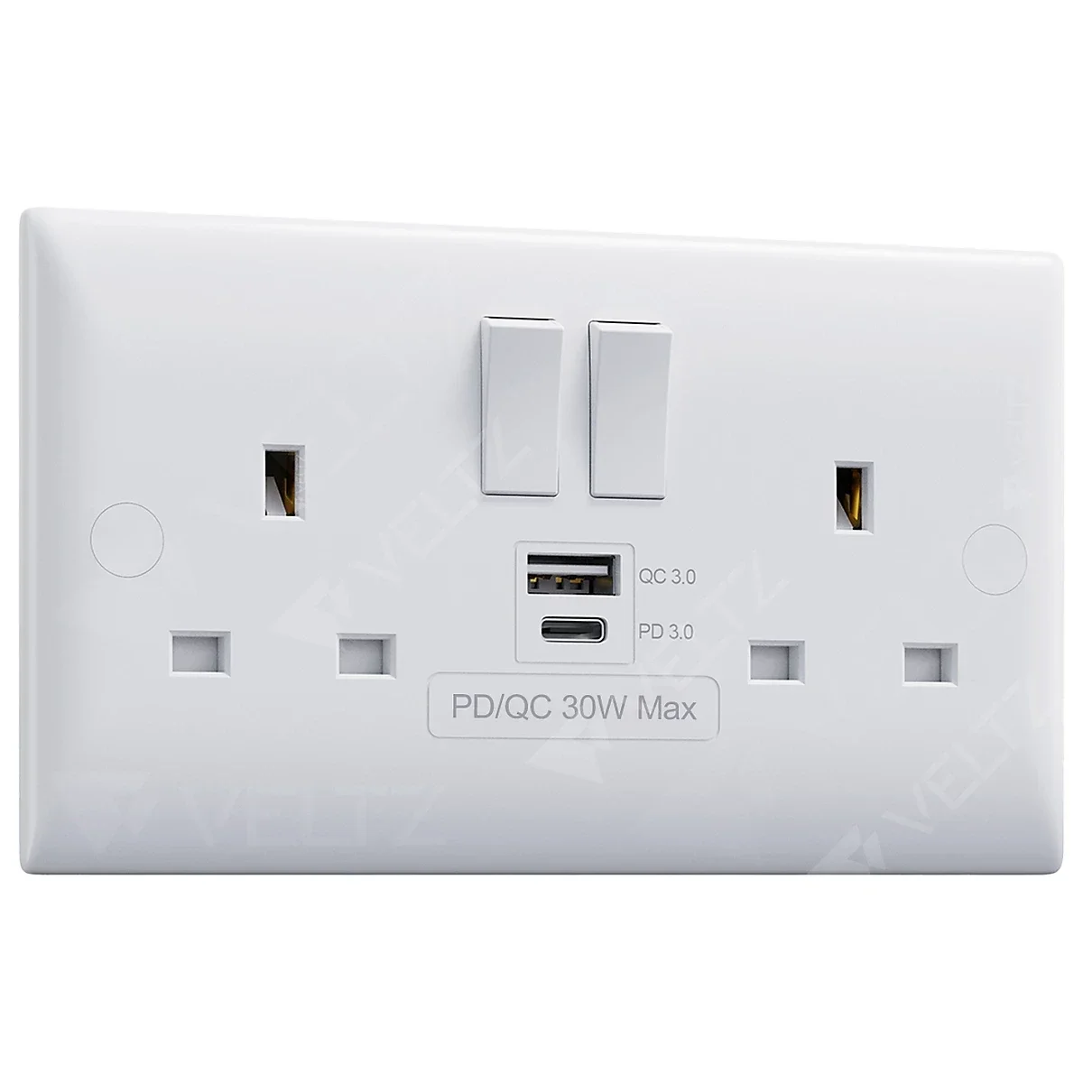 30W PD USB-C & 18W QC 4.0 USB-A, Super Fast Charging, Double Plug Wall 13A 2 Gang, White